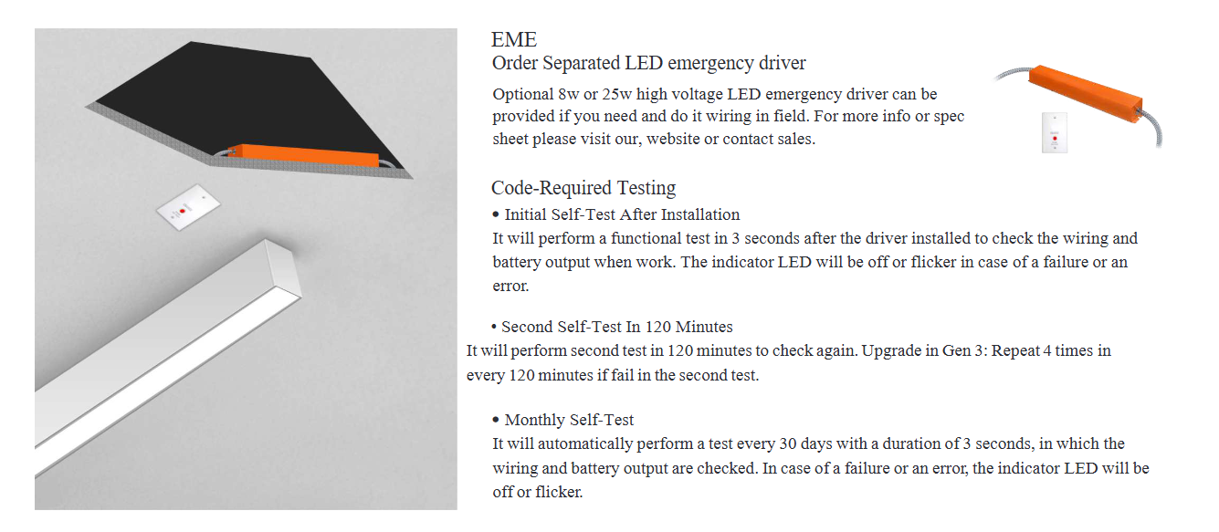 IUS Lighting offers UL& CEC Listed LED emergency drivers. They could be factory installed or field installed. When AC power fails it, immediately switches to the emergency mode operating for lighting minimum 90 minutes. When AC power is restored it, automatically returns to the charging mode which meets critical life-safety lighting requirements.