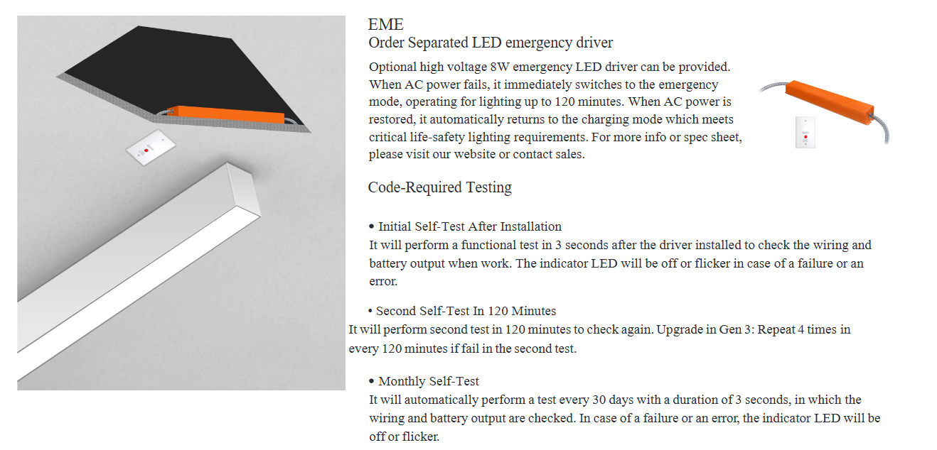 IUS Lighting offers UL& CEC Listed LED emergency drivers. They could be factory installed or field installed. When AC power fails it, immediately switches to the emergency mode operating for lighting minimum 90 minutes. When AC power is restored it, automatically returns to the charging mode which meets critical life-safety lighting requirements.