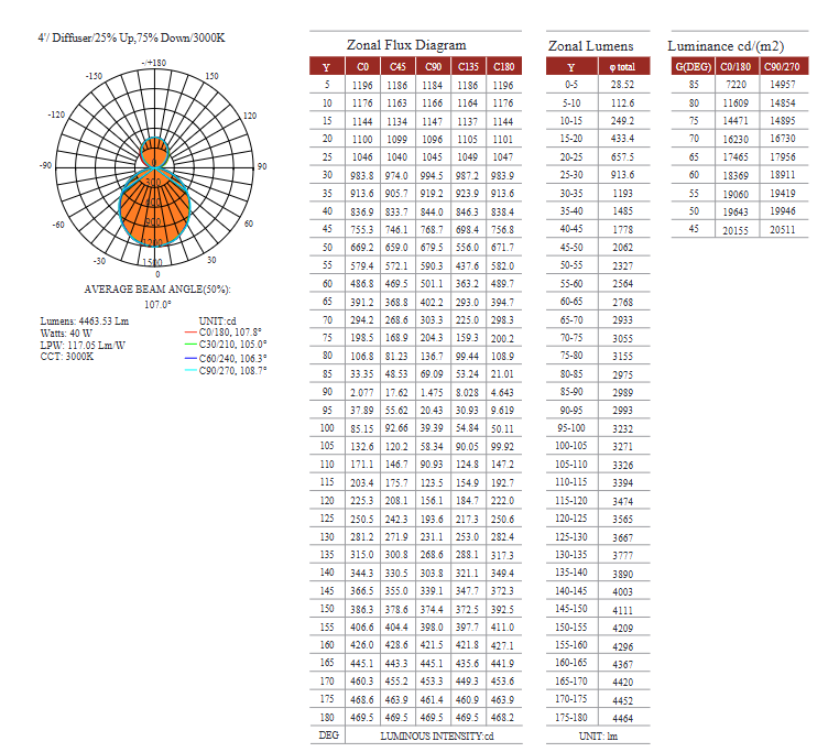 4' | 40W/30W/20W | 1840~3680lm | 2040~4080lm | 1940~3880lm | 1700~3400lm | 1900~3800lm | 1800~3600lm | ||