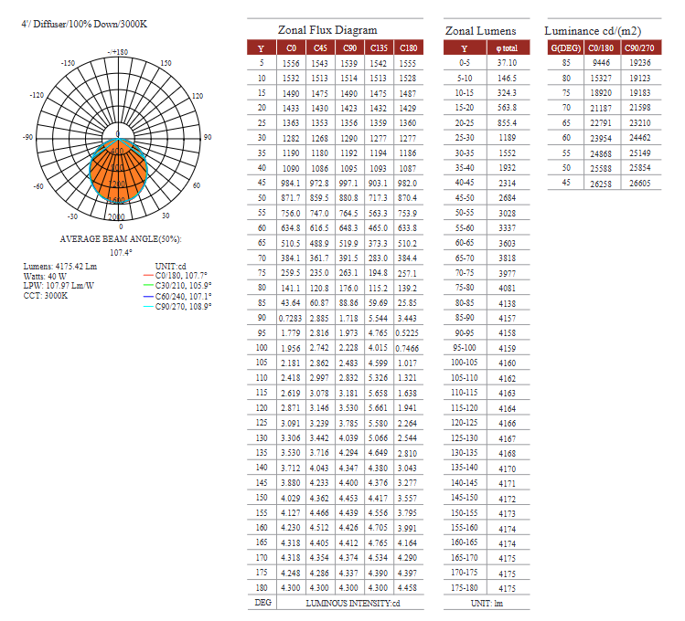 4' | 40W/30W/20W | 2240~4480lm | 2440~4880lm | 2340~4680lm | 2100~4200lm | 2300~4600lm | 2200~4400lm | ||