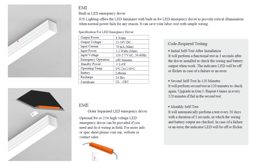IUS Lighting offers UL& CEC Listed LED emergency drivers. They could be factory installed or field installed. When AC power fails it, immediately switches to the emergency mode operating for lighting minimum 90 minutes. When AC power is restored it, automatically returns to the charging mode which meets critical life-safety lighting requirements.