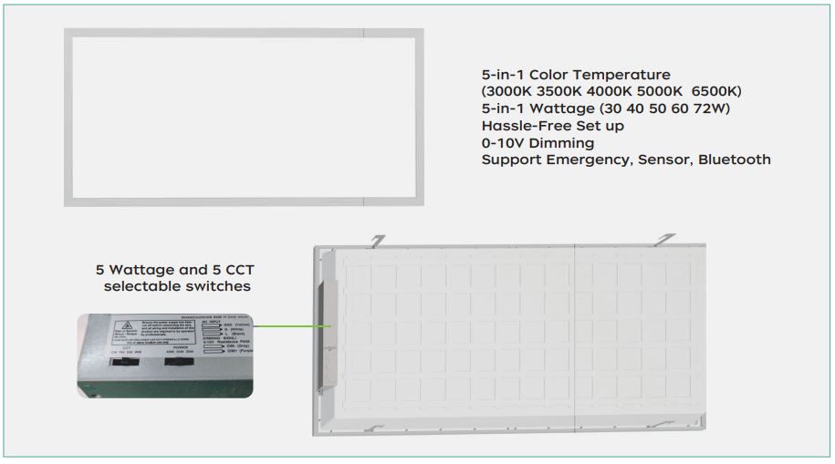 2' x 4' Backlit Panel, Power Switchable 30W/40W/50W/60W/72W, Color Switchable 3000K/3500K/4000K/5000K/6500K, 120-277VAC |