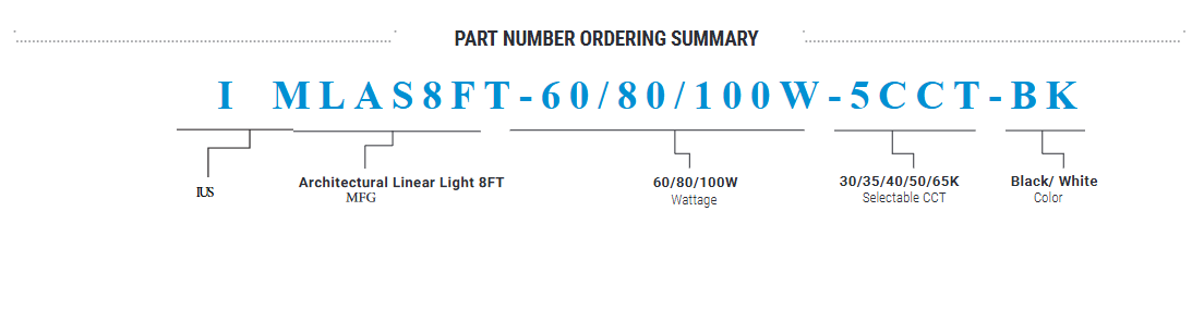 The IMLAS series offers LED fixtures in three sizes: 2ft, 4ft, and 8ft. The 2ft model is available in 15, 20, and 25-watt options, the 4ft model in 30, 40, and 50 watts, and the 8ft model in 60, 80, and 100 watts. Each fixture has selectable color temperatures of 3000K,3500K, 4000K, 5000K, and 6500K and operates within a voltage range of 120-277V. With a CRI of 80+ and UL listed, it ensures both safety and efficiency for a wide range of applications.