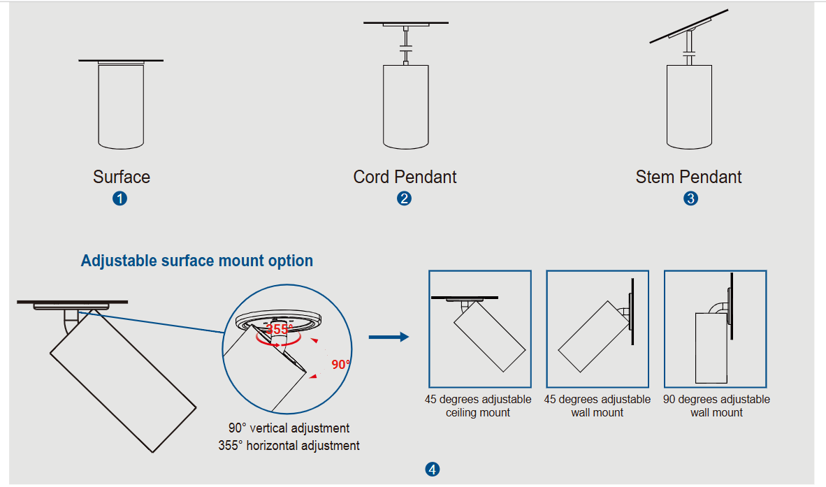 Indoor Architecture Cylinder MACD02 Series is a luminaire with endless possibilities. Whether you want to create a conspicuous effect or a low-key overhead effect, you can achieve it with multiple colors, multiple mounting options, multiple optics, beam angle selectable, CCT selectable options and more. MACD02 uses high color rendering 80CRl or 90CRl LEDs to ensure excellent color consistency and provide smooth, uniform and excellent lighting for the space, thereby providing residents with a comfortable living experience.