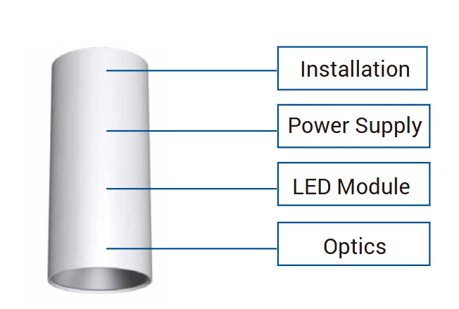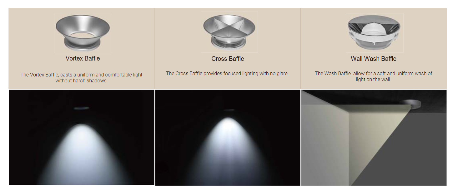 The cylinder features a universal housing that allows for the addition of different baffles to achieve various light distributions.