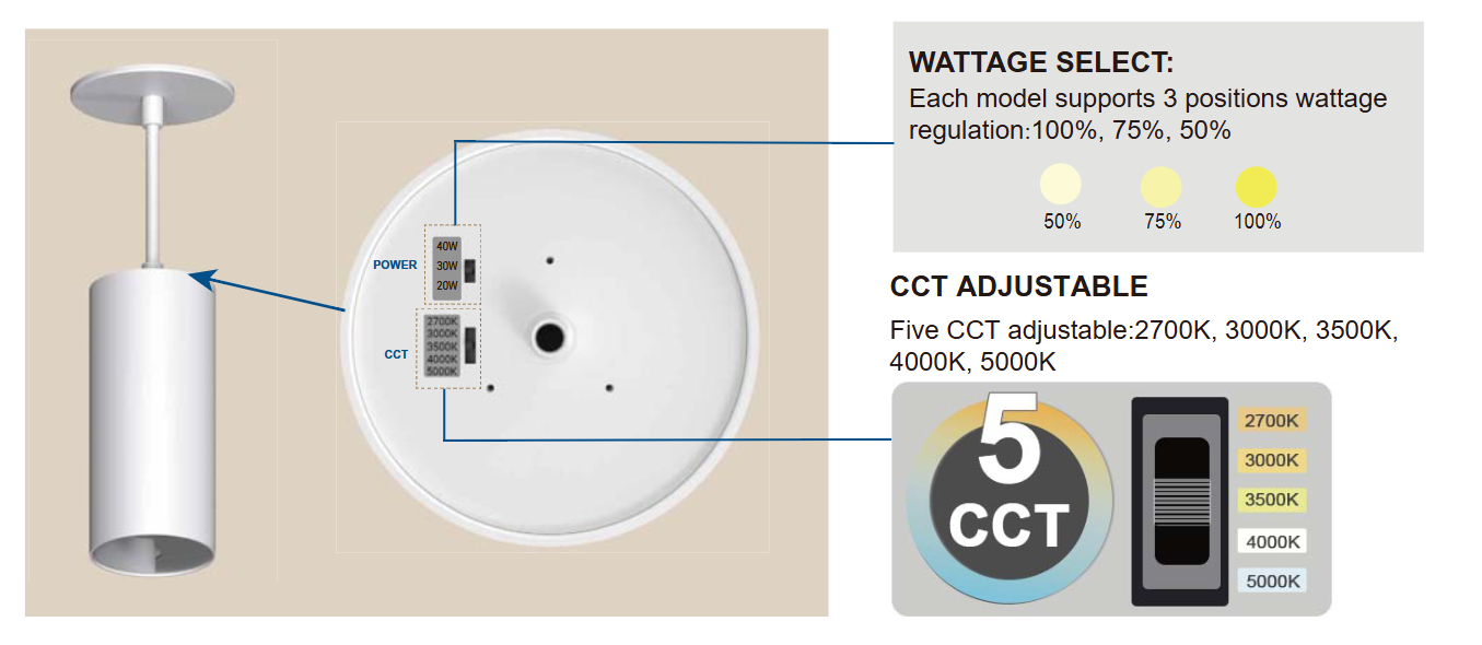 This Cylinder Light allows for on-site adjustment of lumen output and color temperature, supporting adjustments for 3 lumen outputs and 5 color temperatures.