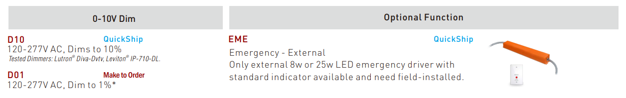 | Min Internal LED Driver | It is powered by Class 2 high efficiency LED driver, with a standard 0-10V dimming that works with many types of controls. Continuous dims to 10% (standard), 1% (optional) . Tested Dimmers: LEVITON DD710, LUTRON NTSTV-DV, LEGRAND RH4FBL3PTC, LUTRON DVSTV, LEVITON IP710. |