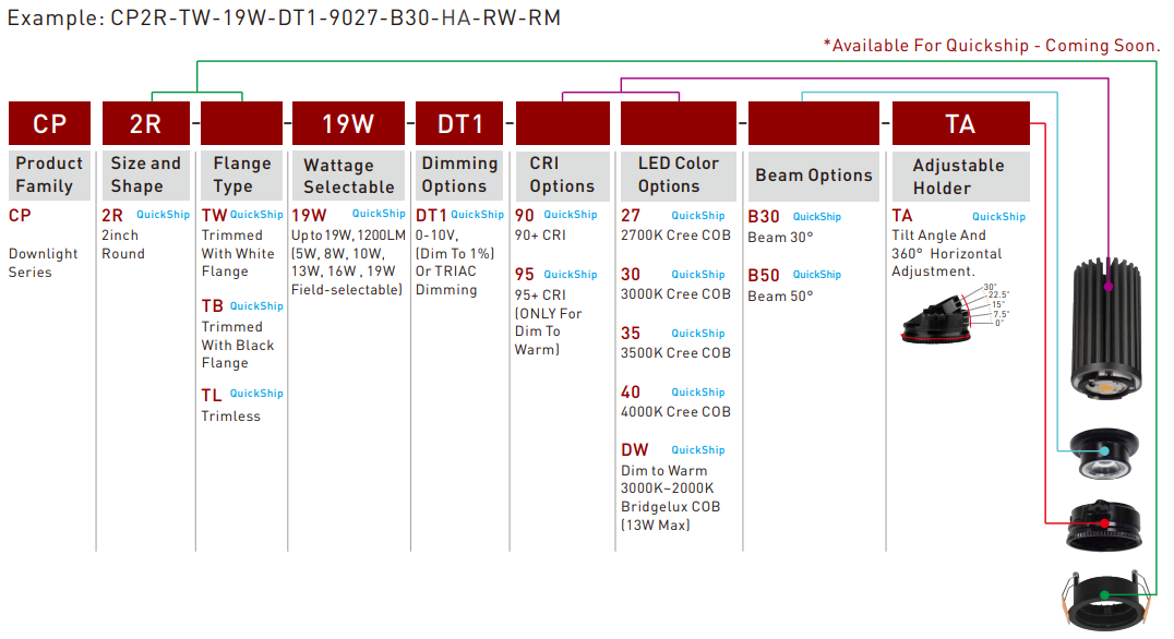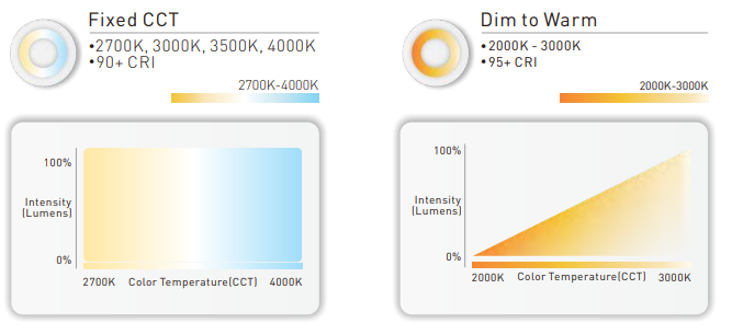 | CCT | 2700K,3000K, 3500K and 4000K fixed CCT with a great color consistency or Dim to Warm from 3000K to 2000K. |