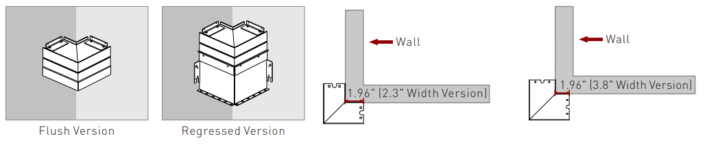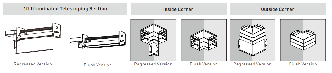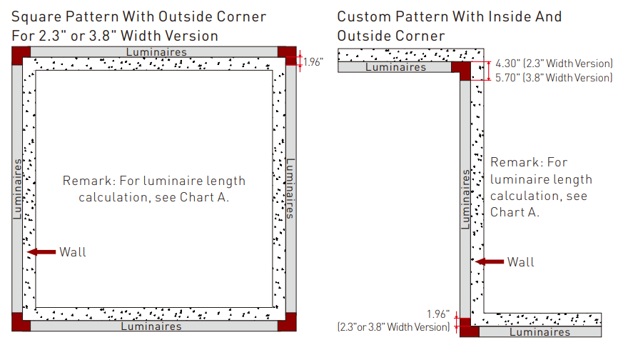 Patterns can be customized with illuminated 90° inside or outside corners, featuring standard 2' corner junction lengths. These fully illuminated, factory-built corners come in an all-in-one box for easy, streamlined installation.